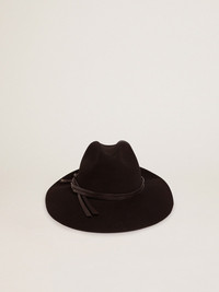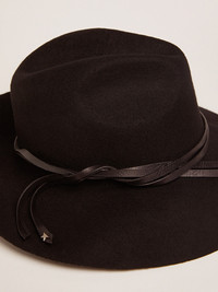 A unique, timeless collection that encompasses the essence of Golden Goose, designed to remain with you every day and accompany your highs and lows, come rain or shine. This black pure wool Fedora hat features a black woven leather strap and a stud in the shape of the iconic Golden star. Forever, for you. DETAILS Item No. GUP01079.P000666.90100 - Color: black - Black woven leather strap - Silver stud in the shape of the Golden star on the strap - Main material: 100% wool - Lining: 60% cotton, 40% acetate - Made in Italy