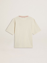 Created to celebrate Chinese New Year and the Year of the Snake, this piece represents transformation and rebirth, combining elegance and symbolism in every detail. In worn-white cotton, this unisex round-neck T-shirt features hand embroidered detailing in red on the neckline and floral embroidery with red logo on the chest. Micro-distressing on the edges and subtle yellowing which give the T-shirt a lived-in look add the finishing touches. DETAILS Item No. GUP01873.P002022.11560 - Color: worn white - Double star on the back - Lived-in effect - Red embroidery on the neckline - Floral embroidery with red logo lettering - Micro distressing on the hem and cuffs - Regular fit - Lived-in effect - Main material: 100% cotton - Made in Italy