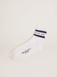 Our socks are made using traditional techniques and are inspired by the vintage theme that runs throughout all Golden Goose collections: American vibes thanks to the double navy blue stripe, rendered unique by distressed finishes. Navy blue Golden Goose logo. DETAILS Item No. GUP00883.P000487.81236 - Main material: cotton 74%, polyamide 25%, elastane 1% - Double navy blue stripe - Finishes with distressed details - Navy blue Golden Goose logo - Navy blue ''Golden Goose property'' print on the sole - Unisex model - Made in Italy Size S corresponds to a 35-38
