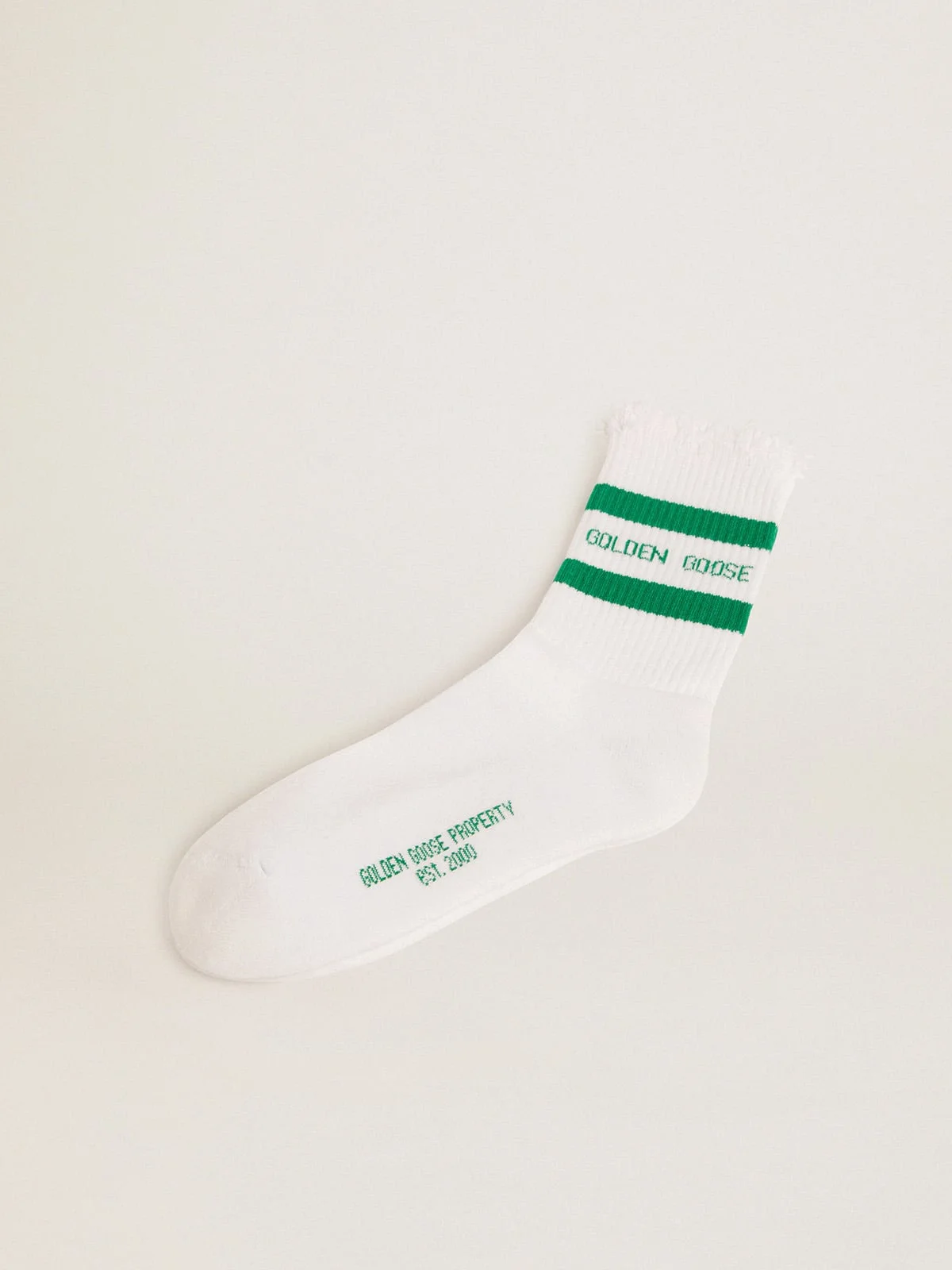 Our socks are made using traditional techniques and are inspired by the vintage theme that runs throughout all Golden Goose collections: American vibes thanks to the double green stripe, rendered unique by distressed finishes. Green Golden Goose logo. DETAILS Item No. GUP00883.P000487.81237 - Main material: cotton 74%, polyamide 25%, elastane 1% - Double green stripe - Finishes with distressed details - Green Golden Goose logo - Green ''Golden Goose property'' print on the sole - Unisex model - Made in Italy - Made in Italy Size S corresponds to shoe size 35-39