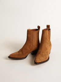 Rock soul and timeless style: the pointed toe, slim fit and minimal design of the Debbie ankle boot make it perfect for any occasion. In this low version, these boots feature a brown suede upper with stretch insert on the side, and tone-on-tone stitching. The metal stud detail and gold-colored metal plaque engraved with the Golden Goose signature on the heel complete the look. DETAILS Item No. GWF00549.F004496.55100 - Brown suede upper - Stretch insert on the side - Tone-on-tone stitching - Metal studs on the back - Gold-colored metal plaque engraved with the Golden Goose signature on the heel - Heel height: 4.5 cm - Leg height: 15 cm - Upper: 100% cow leather - Lining: 100% cow leather - Sole: 100% cow leather