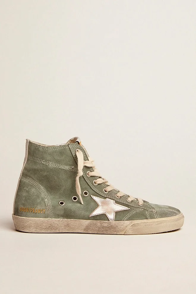 The Seventies, today: inspired by the world of basketball, the style of the Francy sneakers is updated with unexpected details and special finishes. This model with a military-green suede upper features a silver metallic leather star and a white leather heel tab. The contrasting stitching details and cream-colored laces add the finishing touch. DETAILS Item No. GWF00113.F002454.35769 - Military-green suede upper - Silver metallic leather star - White leather heel tab - Contrasting stitching details - Cream-colored laces - Vintage finish - Upper: 100% cow leather - Lining: 60% cotton, 40% cow leather - Sole: 100% rubber - Handmade - Made in Italy