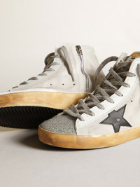 The Seventies, today: inspired by the world of basketball, the style of the Francy sneakers is updated with unexpected details and special finishes. This model with a white suede upper features a black leather star and a tongue in silver-colored Swarovski micro-crystals. The heel tab in metallic silver-colored leather and the ice-gray laces add the finishing touches. DETAILS Item No. GWF00113.F003367.10250 - White suede upper - Black leather star - Tongue in silver-colored Swarovski micro-crystals - Silver metallic leather heel tab - White leather inserts - Ice-gray laces - Vintage finish - Upper: 73% cow leather, 27% crystals - Lining: 57% cotton, 43% cow leather - Sole: 100% rubber
