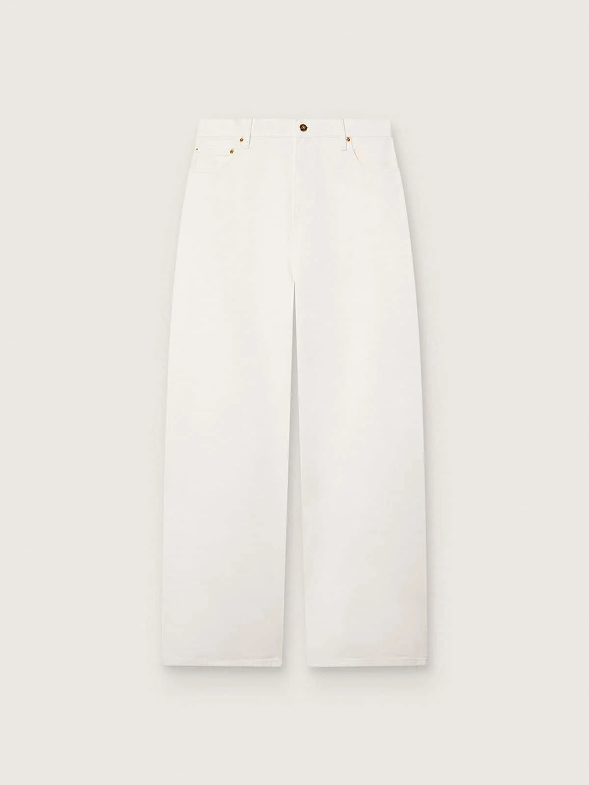 A unique, timeless collection that encapsulates the Golden Goose DNA, designed to remain with you every day, through thick and thin, come rain or shine. These women's jeans with a boyfriend fit feature an oversized fit, a straight cut and a classic five-pocket design, and are made from optical white cotton bull denim. The gold double star embroidered on the back completes the look. DETAILS Item No. GWP02079.P000980.10190 - Golden Collection - Color: optical white - Women's model - Oversized fit - Cotton bull denim - Five-pocket design - Double gold star on the back - Main material: 100% cotton - Pocket lining: 65% polyester, 35% cotton - Made in Italy The model is 177 cm tall and is wearing a size 27.