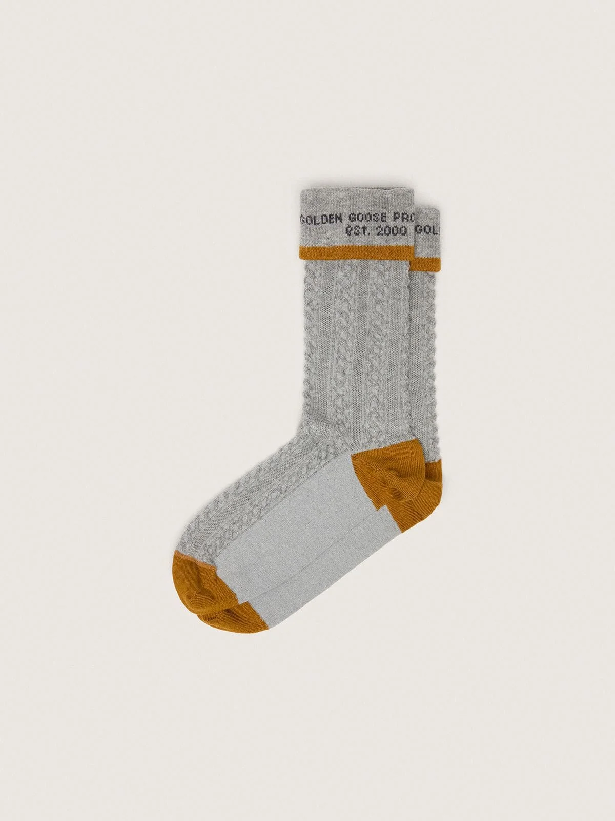 A vintage feel and craftsmanship are some of our distinctive components: these gray socks feature woven embroidery and orange-colored details. The “Golden Goose property” jacquard lettering embroidered on the turn-up adds the finishing touch. DETAILS Item No. GUP02373.P002429.60669 - Journey Collection - Color: gray - Stitched turn-up - Woven embroidery - Orange-colored details - “Golden Goose property” jacquard embroidery on the turn-up - Main material: 61% cotton, 35% polyamide, 4% spandex - Unisex style - Made in Italy