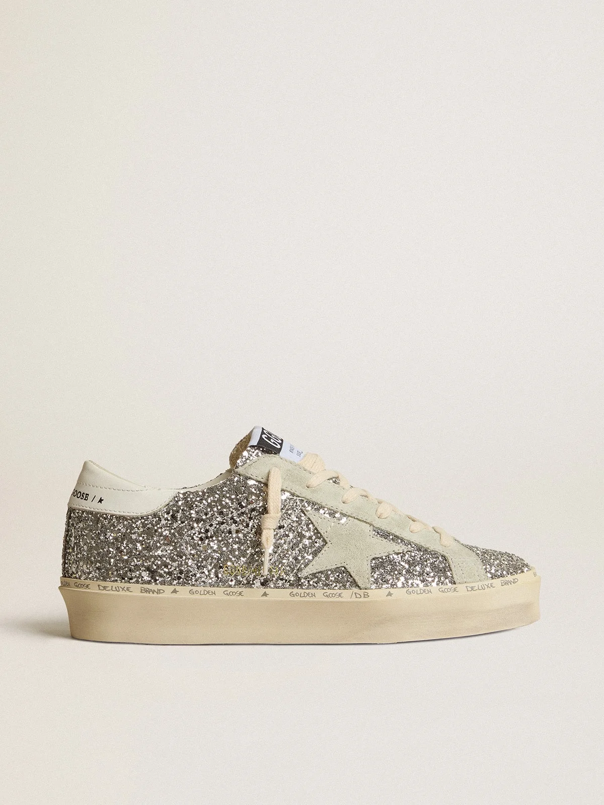 Double height and iconic design: inspired by our Super-Star sneakers, the Hi Star sneakers feature double foxing, embellished with hand lettering. This model in silver glitter features an ice-gray suede star and white leather heel tab. The ice-gray suede inserts and cream laces add the finishing touch. DETAILS Item No. GWF00118.F005100.70287 - Silver glitter upper - Ice-gray suede star - White leather heel tab - Ice-gray suede inserts - Cream laces - Vintage finish - Upper: 55% polyethylene, 29% cotton, 16% cow leather - Lining: 41% polyurethane, 41% cotton, 12% viscose, 6% polyester - Sole: 100% rubber - Handmade - Made in Italy