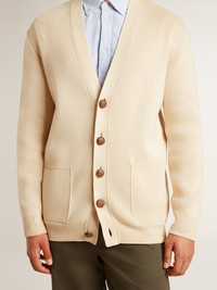 Men’s beige cardigan with 'Golden' lettering on the back