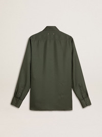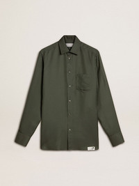 Inspired by the iconic Seventies, the carefree spirit of that era comes to life with the first drop of our Fall/Winter 25 collection. This men's soft dark green shirt features a vertical striped pattern and a pocket on the chest. The white branded label on the hem and two little stars add the finishing touch. DETAILS Item No. GMP00246.P002154.35547 - Journey Collection - Color: dark green - Double star on the back - Pocket on the chest - Vertical stripe pattern - White branded label on the hem - Main material: 100% viscose - Made in Italy The model is 183 cm tall and is wearing a size M.