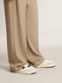 Inspired by the glory days of American basketball, the Forty2 sneaker channels the evergreen charm of the 1990s. Its chunky low-top silhouette and sporty design evoke a legendary journey, celebrating the indomitable spirit of the eternal dreamer. With its unique handcrafted construction and micro-perforated inserts, this men’s version in worn white leather features details with a 3D textured effect, such as the pink TPU star and pink leather insert on the back, and a white leather heel tab. The gray piping and cream-colored vintage-effect laces add the finishing touch. DETAILS Item No. GMF00630.F005711.10310 - Worn white leather upper - Pink 3D textured-effect TPU star - White leather heel tab - Micro-perforated inserts in worn white leather - Pink 3D textured-effect leather insert on the back - Woven label with custom print - Striped-effect white nylon tongue and inserts - Lived-in finish - Leather insole and double-density foam - Double sole with bandage-effect foxing - Color block effect sculpted outsole - Gray textured piping - Cream-colored vintage-effect laces - Dark gray eyestay with logo in 3D textured effect TPU - Upper: 84% cow leather, 15% polyester, 1% textile polyurethane - Lining: 38% polyester, 38% cotton, 20% cow leather, 2% textile polyurethane, 2% spandex - Sole: 100% rubber - Handmade - Made in Italy