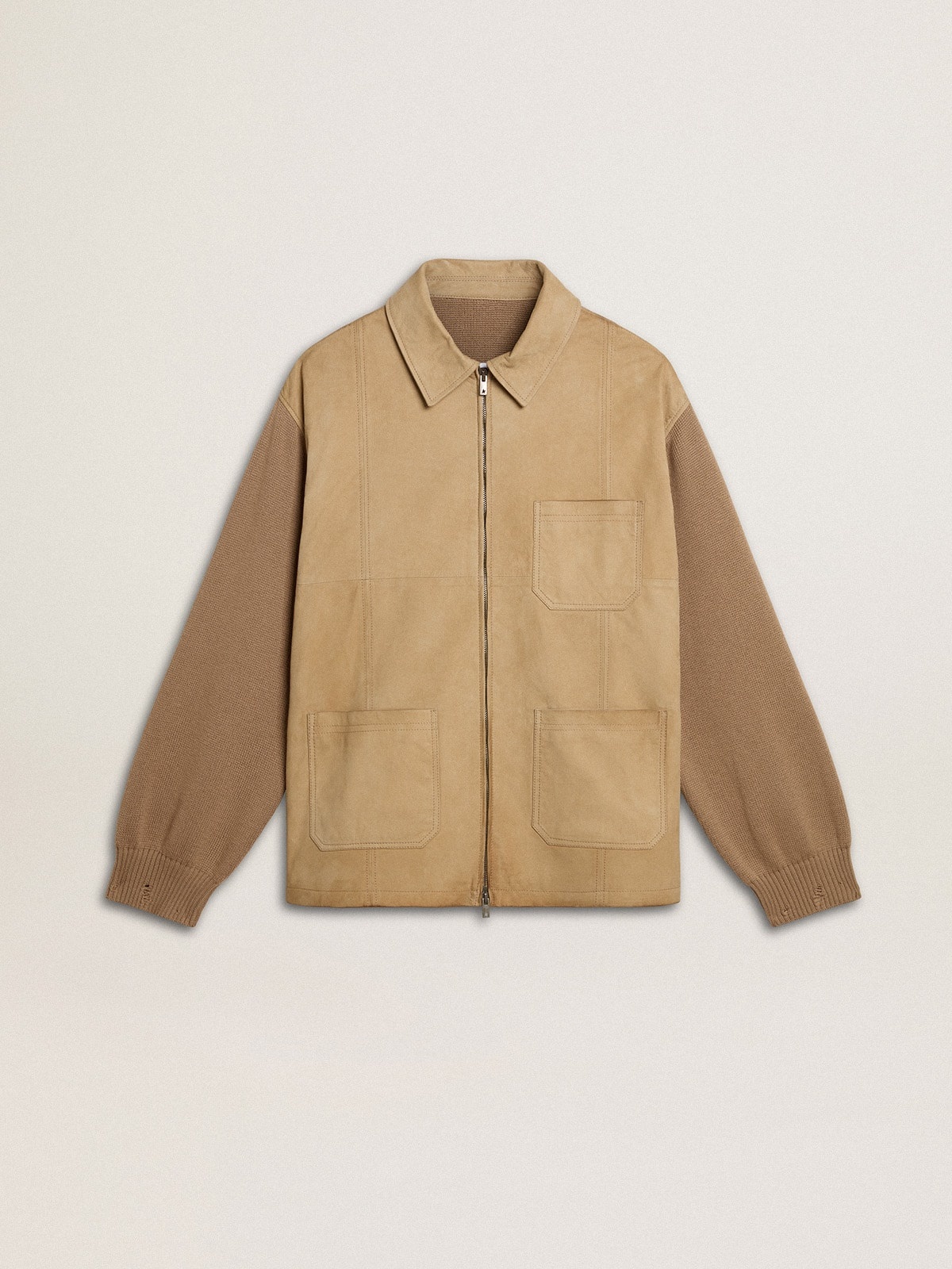 Men's jacket in travertine-colored nubuck leather with wool-blend sleeves and back