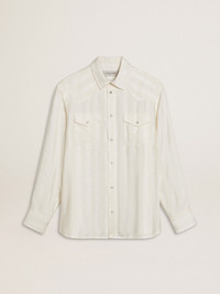 Inspired by the electric energy of the Nineties, the collection celebrates the limitless power of shared dreams. Moved by passion, each design captures the meaning of togetherness and the power of music. In white viscose, this oversized fit shirt features vertical cotton stripes and two front pockets. The five snap button closure adds the finishing touch. DETAILS Item No. GMP02252.P001877.20103 - Journey Collection - Color: white - Oversized fit - Double star on the back - Two front pockets - Tone-on-tone vertical stripes - Snap button closure - Main material: 96% viscose, 4% cotton - Made in Italy The model is 183 cm tall and is wearing a size M.