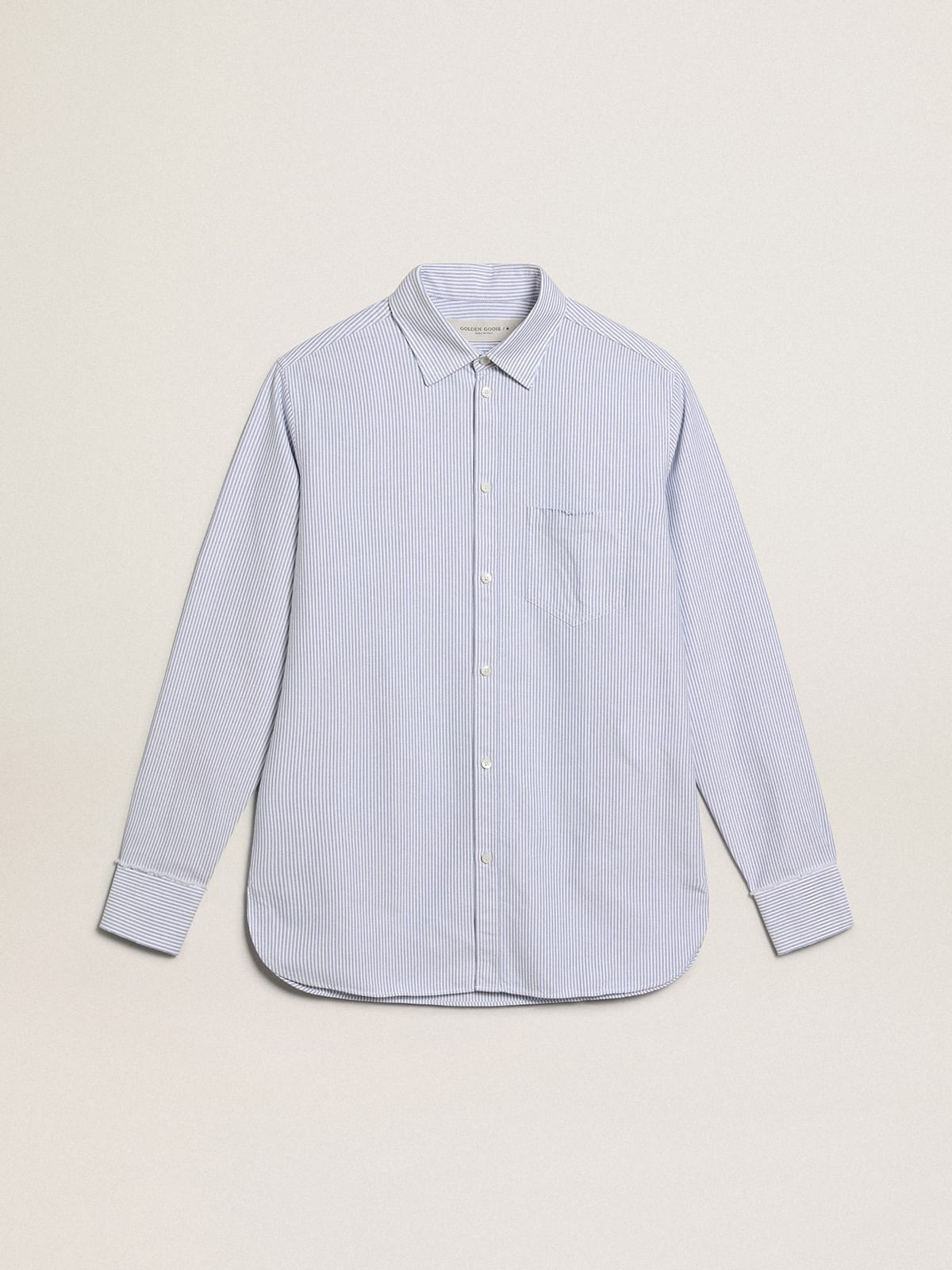 A unique, timeless collection that encapsulates the Golden Goose DNA, designed to remain with you every day, through thick and thin, come rain or shine. In white cotton with a distressed treatment, this regular-fit men’s shirt features light blue candy stripes and a detachable white patch with a finely embroidered letter G in red. DETAILS Item No. GMP00246.P000548.80197 - Color: white and light blue - Candy stripes - Double gold star on the back - Detachable white patch with embroidered red letter G - Regular fit - Long sleeves - Button fastening - Front pocket - Distressed treatment - Main material: 100% cotton - Made in Italy The model is 183 cm tall and is wearing a size M.