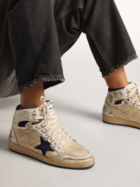 A reinterpretation of high-top sneakers with an authentic soul: inspired by our Ball Star model, our Sky-Star sneakers have an American college vibe and a feel of the basketball scene of the Eighties. This men’s model features a cream-colored nylon upper with white leather inserts and the Golden Goose signature on the neck of the ankle, a reference to the childhood dream of having your favorite sneakers signed by basketball legends. The dark blue suede star, white leather and dark blue suede heel tab and cream-colored laces complete the look. DETAILS Item No. GMF00230.F003339.10357 - Cream-colored nylon upper with white leather inserts - Dark blue suede star - White leather and dark blue suede heel tab - Cream-colored laces - Vintage finish - Upper: 56% cow leather, 44% polyamide - Lining: 66% cotton, 27% polyester, 7% cow leather - Sole: 100% rubber - Handmade - Made in Italy