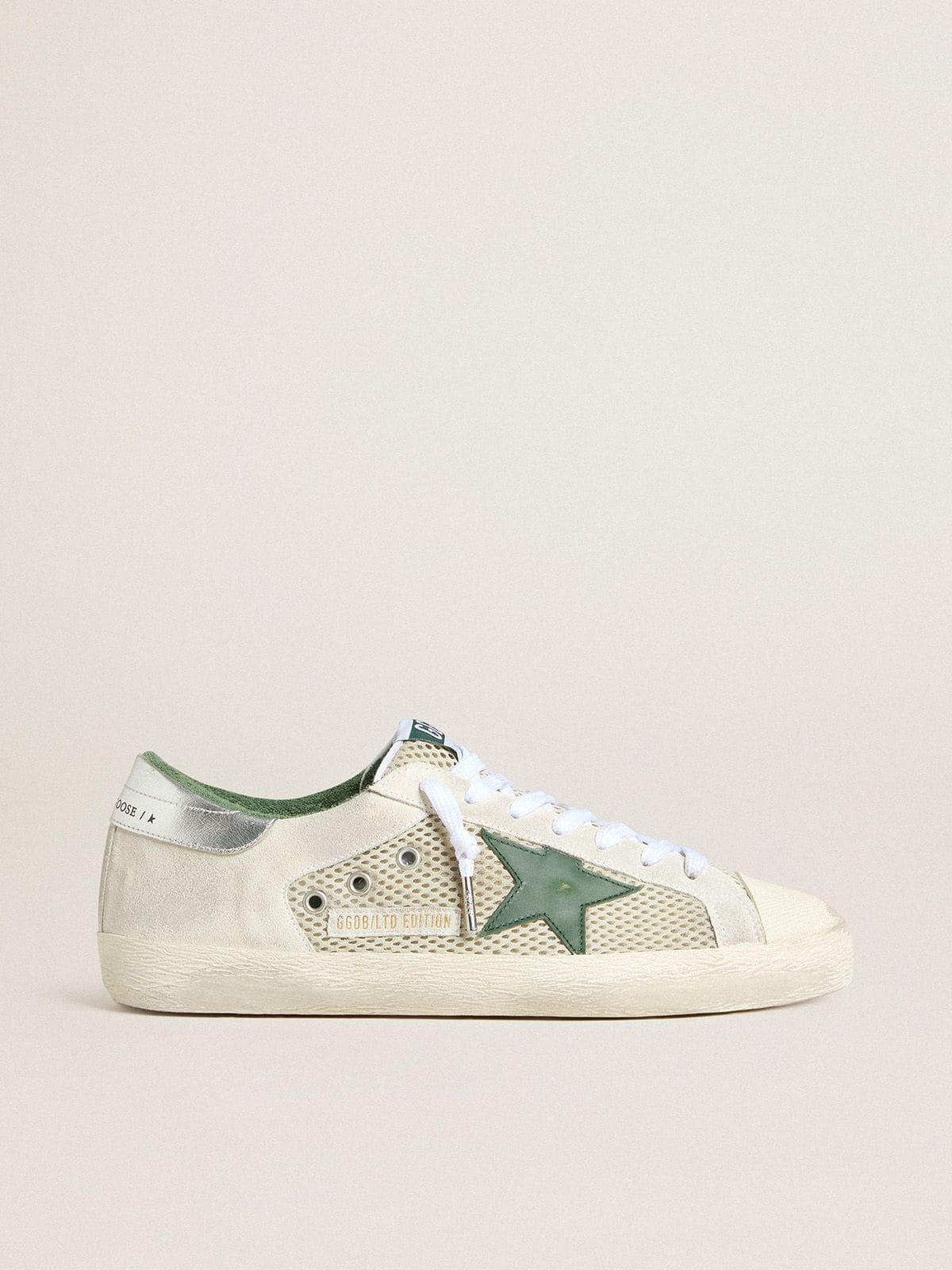 Men’s Super-Star in white suede and mesh with green leather star and silver heel tab