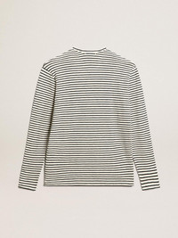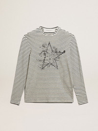 A unique, timeless collection that encompasses the essence of Golden Goose, designed to remain with you every day and accompany your highs and lows, come rain or shine. This cotton and linen long-sleeved T-shirt features a white and blue stripe motif and blue embroidery on the front. The detachable white patch with a finely embroidered letter G in red adds the finishing touch. DETAILS Item No. GMP00856.P000645.81266 - Color: white and blue - Blue embroidery on the front - Double gold star on the back - Detachable white patch with embroidered red letter G - Regular fit - Long sleeves - Main material: 66% cotton, 34% linen - Made in Italy The model is 183 cm tall and is wearing a size M.
