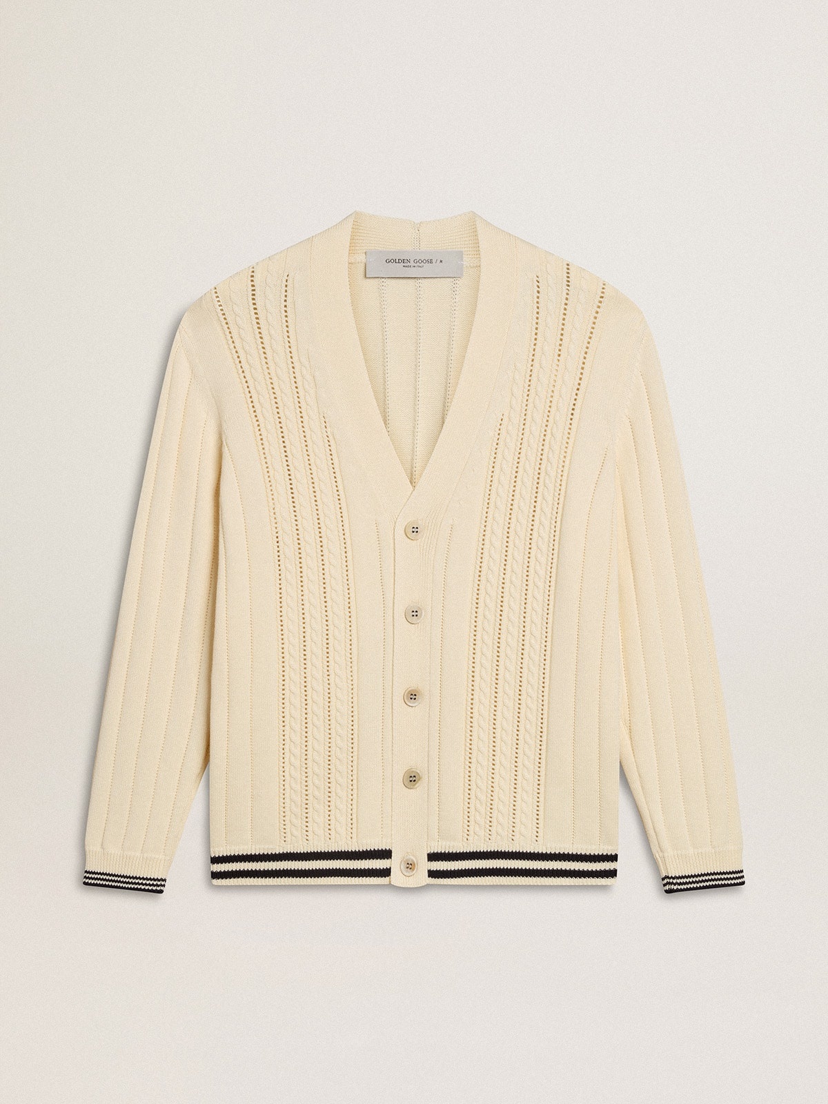 Inspired by the electric energy of the Nineties, the collection celebrates the limitless power of shared dreams. Moved by passion, each design captures the meaning of togetherness and the power of music. In worn-white cotton, this men's cardigan features a cable pattern on the front and dark blue striped ribbing on the hem and sleeves. DETAILS Item No. GMP02118.P001911.11782 - Journey Collection - Color: worn white - Double star on the back - Five-button closure - Dark blue striped ribbing on the hem and at the end of the sleeves - Cable pattern - Main material: 100% cotton - Rib material: 100% cotton - Made in Italy The model is 183 cm tall and is wearing a size M.