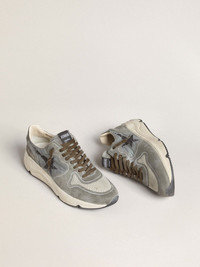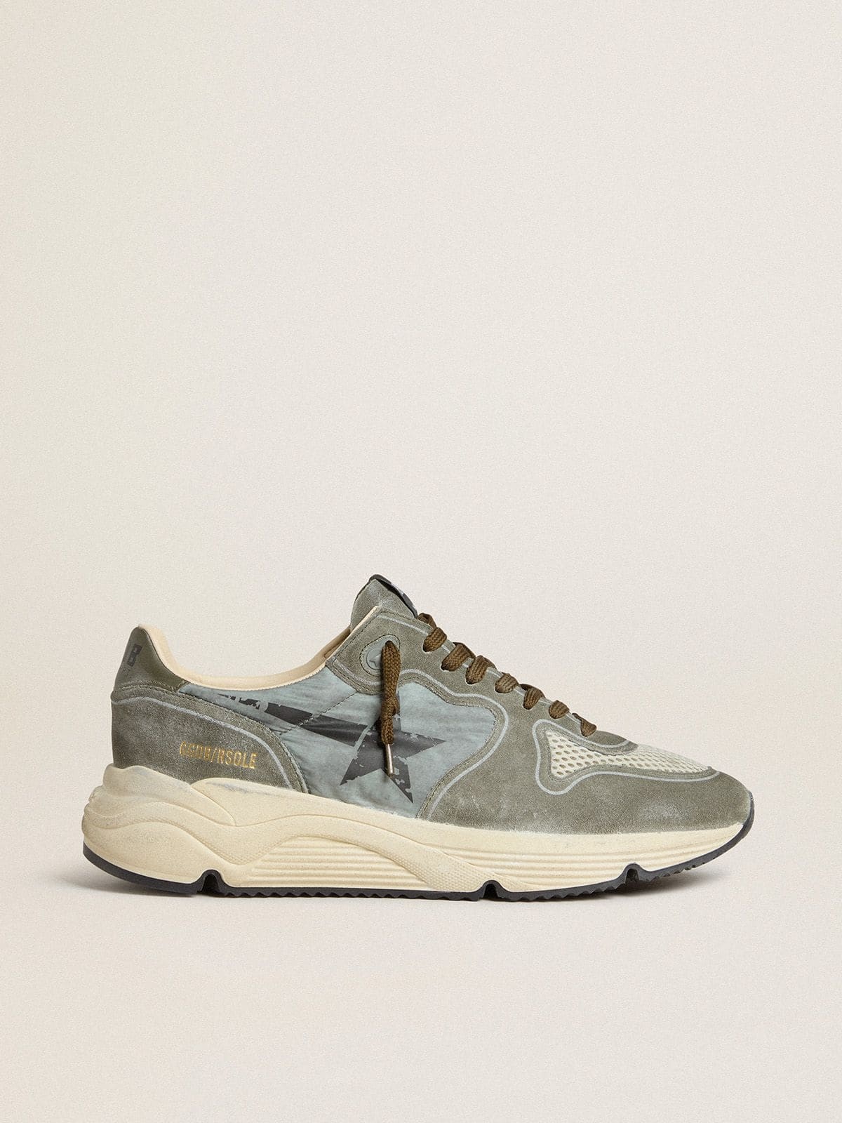 Urban style and a spirit of craftsmanship are combined in our Running Sole sneakers: the ideal companion for your metropolitan adventures. This model, with a light blue nylon upper accentuated by green suede inserts, features a black star and a green leather heel tab. Brown laces add the finishing touch. DETAILS Item No. GMF00126.F007359.35929 - Light blue nylon upper with green suede inserts - Black star - Green leather heel tab - Brown laces - Vintage finish - Upper: 58% cow leather, 25% polyamide, 17% polyester - Lining: 49% cotton, 26% polyester, 22% cow leather, 3% textile polyurethane - Sole: 100% rubber - Handmade - Made in Italy