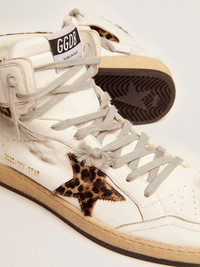 A reinterpretation of high-top sneakers with an authentic soul: inspired by our Ball Star model, our Sky-Star sneakers have an American college vibe and a feel of the basketball scene of the Eighties. Made of white nappa leather with leopard-print pony skin inserts, this women’s model features the Golden Goose signature on the neck of the ankle, a reference to the childhood dream of having your favorite sneakers signed by basketball legends. DETAILS Item No. GWF00230.F002193.10805 - Color: white - Leopard-print pony skin star - Ice-gray laces - Upper: 93% sheepskin leather, 7% cow leather - Lining: 67% cow leather, 33% cotton - Sole: 100% rubber - Handmade - Made in Italy