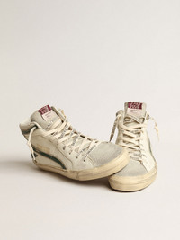 Skate soul, glamorous attitude. Our Slide sneakers take you straight to Venice Beach, between an ollie and a kickflip. This model with beige nappa leather upper features a star and flash in emerald-green laminated leather. The ice-gray suede inserts, including the tongue and heel tab, and the cream-colored laces with contrasting black logo complete the look. DETAILS Item No. GMF00115.F004002.81997 - Beige nappa leather upper - Emerald-green laminated leather star - Ice-gray suede heel tab - Ice-gray suede tongue - Emerald-green laminated leather flash with ice-gray suede edging - Cream-colored laces with contrasting black logo - Vintage finish - Upper: 67% sheepskin leather, 27% cow leather, 6% goatskin leather - Lining: 55% cow leather, 34% cotton, 7% polyester, 4% textile polyurethane - Sole: 100% rubber - Handmade - Made in Italy