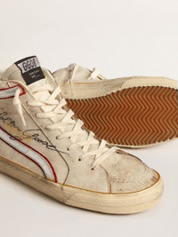 Skate soul, glamorous attitude. Our Slide sneakers take you straight to Venice Beach, between an ollie and a kickflip. With a vintage-effect ecru leather upper accentuated with contrasting signature, this LTD model features a bright blue leather star and a tone-on-tone heel tab. The silver metallic leather flash with red suede edges and ecru laces complete the look. DETAILS Item No. GMF00115.F004577.82305 - Color: ecru - Bright blue leather star - Ecru leather heel tab - Silver metallic leather flash with red suede edges - Contrasting signature on the upper - Ecru laces - Vintage finish - Upper: 86% cow leather, 8% acrylic, 5% sheepskin leather, 1% polyester - Lining: 35% cow leather, 34% cotton, 19% textile polyurethane, 7% polyester, 5% viscose - Sole: 100% rubber - Handmade - Made in Italy