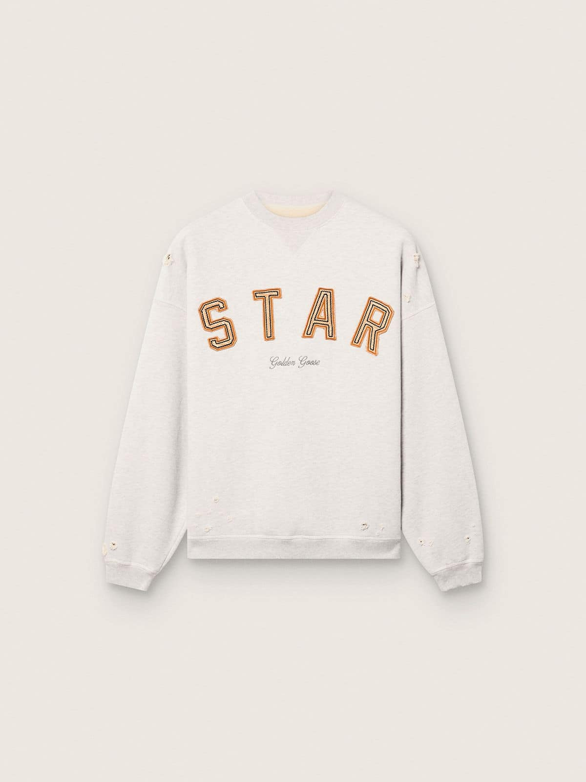 A collection with a casual soul but a versatile attitude: inspired by the Seventies, it has a timeless vintage appeal, suited to any occasion or look. This unisex sweatshirt with an oversized fit is made of gray melange cotton and features a lived-in effect wash and 'Star' lettering in gold embroidered on the front. The triangle detail under the collar, double star and contrasting black Golden Goose logo on the front complete the look. DETAILS Item No. GUP02711.P002412.60665 - Star Collection - Color: vintage gray melange - Unisex oversized fit - Crew-neck model in cotton fleece - Lived-in finish - 'Star' lettering embroidered in gold - Golden Goose logo on the front - Triangle detail under the collar - Double star on the back - Main material: 100% cotton - Edges: 94% cotton, 6% elastane - Decorative fabric: 80% cotton, 20% polyester - Made in Italy The model is 183 cm tall and is wearing a size M.