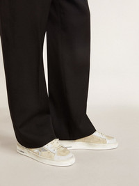 The glorious Nineties wrapped up in a sneaker. The Stardan sneakers pay homage to the basketball icons of that decade, while keeping an eye on the present. In this version, the beige nubuck upper with white crackle leather inserts features a silver metallic leather star and red leather heel tab with beige grosgrain trim. Beige laces add the finishing touch. DETAILS Item No. GMF00333.F006632.15685 - Beige nubuck upper with white crackle leather inserts - Silver metallic leather star - Red leather heel tab with beige grosgrain trim - Beige laces - Vintage finish - Upper: 100% cow leather - Lining: 44% cotton, 25% cow leather, 20% textile polyurethane, 6% polyester, 5% viscose - Sole: 100% rubber - Handmade - Made in Italy
