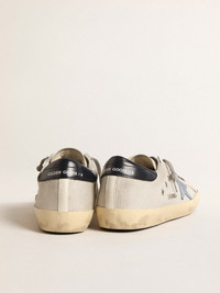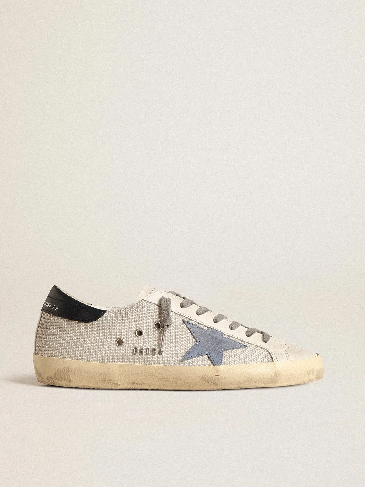 A timeless icon yet one that’s constantly evolving. At Golden, we love taking our classics and reworking them all the time, always from a new angle. With a pale silver mesh upper, these Super-Star feature a powder-blue suede star, midnight-blue glossy leather heel tab and a white leather tongue. And the galvanic silver metal GGDB lettering detail, white leather inserts and gray laces add the finishing touch. DETAILS Item No. GMF00101.F004587.82295 - Pale silver mesh upper - Powder-blue suede star - Midnight-blue glossy leather heel tab - White leather insert on the back - White leather tongue and inserts - Gray laces - Galvanic silver metal GGDB lettering - Vintage finish - Upper: 49% cow leather, 27% cotton, 24% polyester - Lining: 41% cotton, 31% cow leather, 18% textile polyurethane, 6% polyester, 4% viscose - Sole: 100% rubber - Handmade - Made in Italy