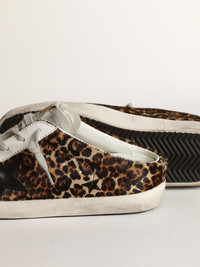 Our iconic sneakers in the new sabot version: this Super-Star model features a leopard-print pony skin upper in beige and brown accentuated with a black leather star and ice-gray suede tongue. The white leather insert and ice-gray laces complete the look. DETAILS Item No. GWF00110.F003380.80189 - Beige and brown leopard-print pony skin upper - Black leather star - Ice-gray suede tongue - White leather inserts - Ice-gray laces - Vintage finish - Upper: 100% cow leather - Lining: 88% cow leather, 12% cotton - Sole: 100% rubber