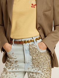 When simplicity is enriched with unique details. This Trinidad model made from dark brown washed leather features silver-colored studs, aged through a galvanic treatment, along its entire length. DETAILS Item No. GWA00408.A000137.55357 - Color: dark brown - Aged silver-colored studs - Aged galvanic finish for the buckle and studs - Fit: high-waisted - Main material: 100% cow leather - Handmade - Made in Italy