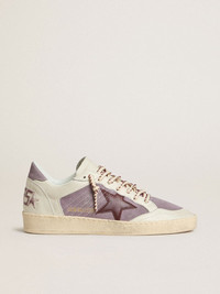 Dreaming of the Eighties. Our Ball Star sneakers have an American college vibe caught between a hoop shot and a skateboard ride. This model with a lilac suede upper and white leather inserts features a burgundy leather star and lilac suede heel tab. And the multicolored laces add the finishing touch: beautiful things that never go out of fashion. DETAILS Item No. GWF00327.F007309.45405 - Lilac suede upper with white leather inserts - Burgundy leather star - Lilac suede heel tab - Multicolored laces - Vintage finish - Upper: 100% cow leather - Lining: 34% cotton, 31% cow leather, 23% textile polyurethane, 8% viscose, 4% polyester - Sole: 100% rubber - Handmade - Made in Italy