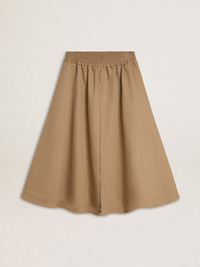 A collection inspired by the harmony of nature, where every detail flows with ease. In a cotton blend, this midi circle skirt features a front zip and an elasticated waist. Two pockets add a casual touch. DETAILS Item No. GWP01953.P001558.15369 - Journey Collection - Color: beige - Midi length - Elasticated waistband - Double star on the back - Full front zip - Two pockets - Main material: 40% elastomultiester, 40% cotton, 20% polyester - Inner material: 100% cotton - Made in Italy The model is 177 cm tall and is wearing a size 40.