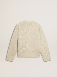 Created to celebrate Chinese New Year and the Year of the Snake, this piece represents transformation and rebirth, combining elegance and symbolism in every detail. This beige sweater for women has a relaxed and simple design, making it perfect for both casual and elegant looks. In virgin wool, it features a tone-on-tone snakeskin pattern. Ribbed fabric trim on the sleeve edges and hem and double gold star on the back add the finishing touch. DETAILS Item No. GWP02276.P001820.11684 - Color: beige - Double star on the back - Round neck - Tone-on-tone snakeskin pattern - Relaxed fit - Main material: 60% virgin wool, 25% mohair, 15% nylon - Made in Italy The model is 177 cm tall and is wearing a size S.