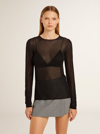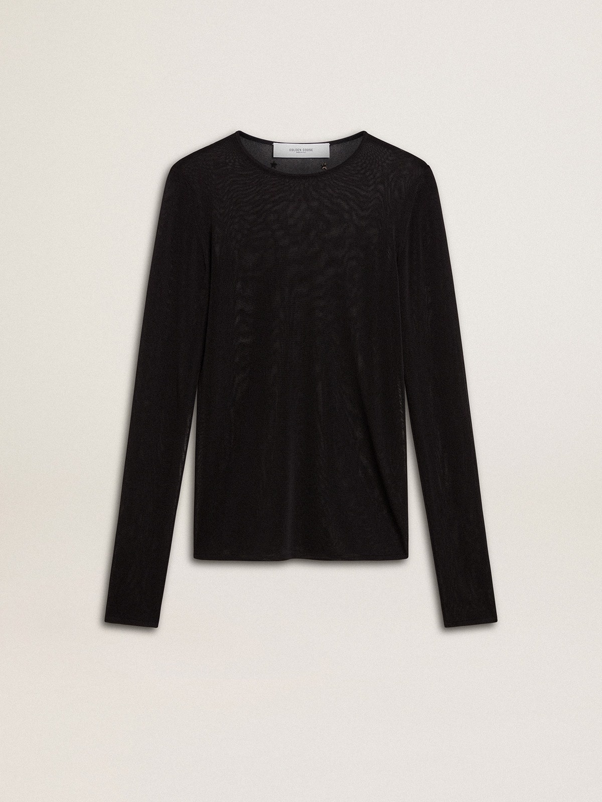 Inspired by the electric energy of the Nineties, the collection celebrates the limitless power of shared dreams. Moved by passion, each design captures the meaning of togetherness and the power of music. This black crew neck t-shirt has a tight fit. The double star on the back adds the finishing touch. DETAILS Item No. GWP02238.P001971.90100 - Journey Collection - Color: black - Tight fit - Second skin effect - Double star on the back - Long sleeves - Main material: 76% viscose, 24% nylon - Rib material: 76% viscose, 24% nylon - Made in Italy The model is 177 cm tall and is wearing a size S.