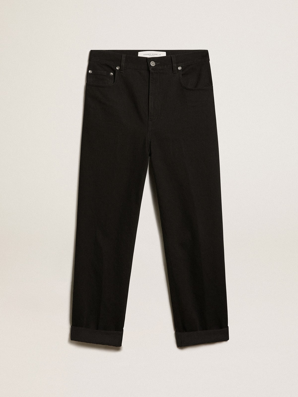 A unique, timeless collection that encompasses the essence of Golden Goose, designed to remain with you every day and accompany your highs and lows, come rain or shine. These black jeans have a wide leg and a detachable white patch with a finely embroidered letter G in red. DETAILS Item No. GWP00844.P000625.90100 - Color: black - Double gold star on the back - Detachable white patch with embroidered red letter G - Wide leg - Five pockets - Main material: 100% cotton - Pocket lining: 65% polyester, 35% cotton - Made in Italy The model is 177 cm tall and is wearing a size 27 (IT).