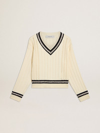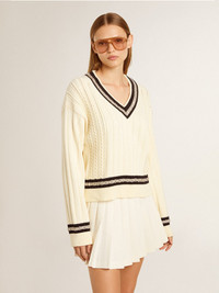 Inspired by the electric energy of the Nineties, the collection celebrates the limitless power of shared dreams. Moved by passion, each design captures the meaning of togetherness and the power of music. In distressed white cotton, this cropped V-neck sweater features blue striped ribs with crystals. The cable pattern and two stars on the back add the finishing touch. DETAILS Item No. GWP02120.P001912.11782 - Journey Collection - Color: worn white - Cropped style - Double star on the back - Cable pattern - Blue striped ribbing with crystals - V-neck - Main material: 100% cotton - Rib material: 100% cotton - Made in Italy The model is 177 cm tall and is wearing a size S.
