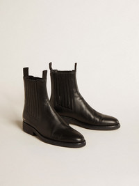 A timeless silhouette: the Chelsea boot, featuring clean simple lines, is the perfect blend of style and comfort. This women’s model features a black leather upper and gold-colored GGDB lettering on the side. The black stretch insert on the side and the galvanic antique gold star on the heel tab complete the look. DETAILS Item No. GWF00540.F004898.90100 - Color: black - Gold-colored GGDB lettering on the side - Stretch insert on the side - Antique gold-colored metal star on the heel tab - Vintage finish - Heel height: 2.5 cm - Leg height: 16.5 cm - Upper: 100% cow leather - Lining: 100% cow leather - Sole: 100% rubber - Handmade - Made in Italy