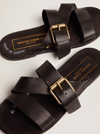 When personality meets practicality: the feminine shape of our Margaret sandals celebrates the versatility of a slip-on design and enhances it with sophisticated details. This version features black crossover resin-coated leather straps and an antique gold color star. The galvanic antique gold buckle completes the look. DETAILS Item No. GWF00323.F003006.90100 - Black resin-coated leather upper - Galvanic antique gold metal buckle - Galvanic antique gold metal star - White contrast lettering on the sole - Vintage finish - Upper: 100% cow leather - Lining: 100% cow leather - Sole: 100% cow leather