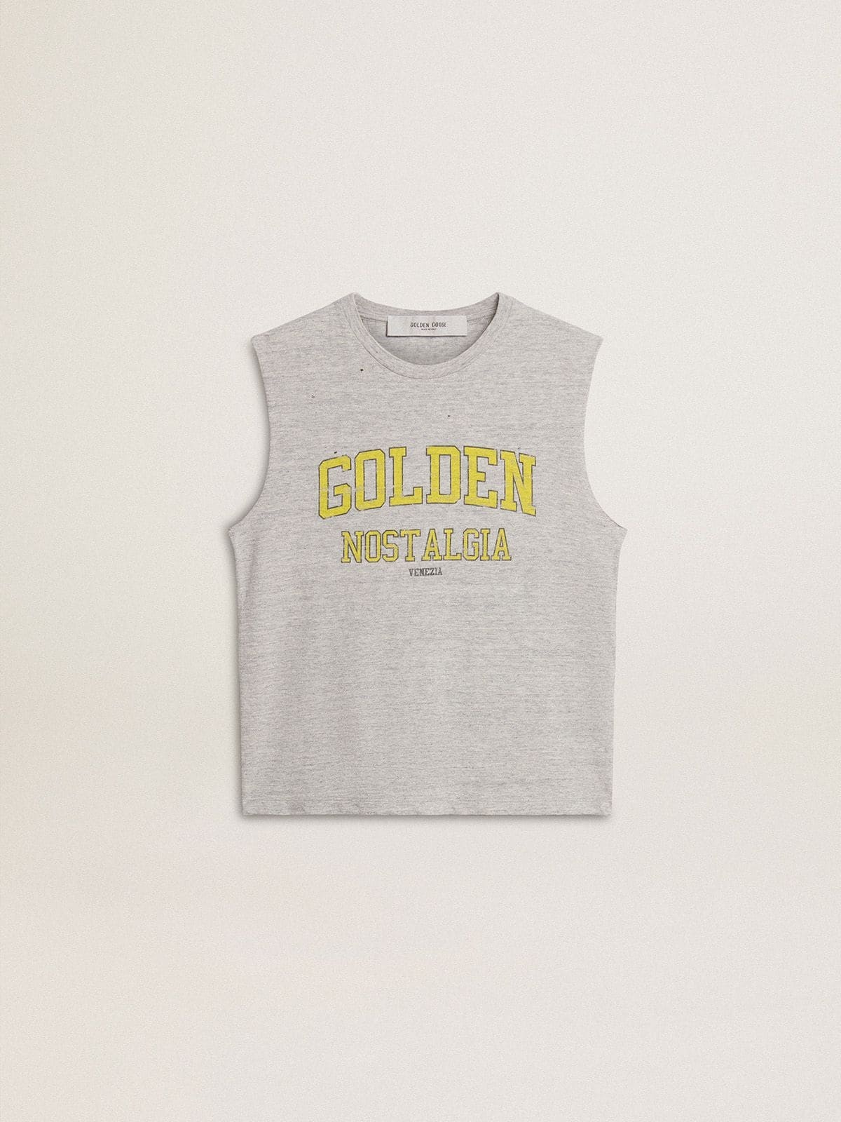 A collection inspired by the harmony of nature, where every detail flows with ease. In gray cotton, this sleeveless T-shirt features a yellow 'Golden Nostalgia' print and a slim fit. DETAILS Item No. GWP02187.P001886.60269 - Journey Collection - Color: gray - Slim fit - 'Golden Nostalgia' print - Sleeveless - Double star on the back - Main material: 100% cotton - Rib material: 100% cotton - Made in Italy The model is 177 cm tall and is wearing a size S.