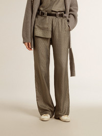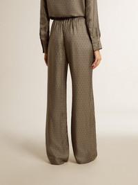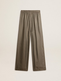 A love story to our home, Marghera. Where everything began. Our latest collection reflects the spirit of our birthplace, its contrasts, industrial soul, and manufacturing landscapes, weaving together inspirations from both the vibrant energy of workwear and the refined essence of traditional tailoring. Made of a green viscose-blend silk, these soft women's joggers feature an all-over floral motif. DETAILS Item No. GWP02028.P001664.60181 - Journey Collection - Color: green - Double star on the back - Loose fit - Printed floral pattern - Two pockets - Elasticated waistband - Main material: 70% viscose, 30% cotton - Made in Italy The model is 177 cm tall and is wearing a size 40.