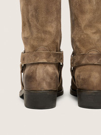 Women's high Biker boots in dark beige waxed suede with strap and a silver-colored buckle
