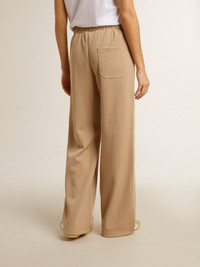 A collection with a casual soul but a versatile attitude: inspired by the Seventies, it has a timeless vintage appeal, suited to any occasion or look. These loose-fit women’s joggers in pinstripe light beige technical jersey feature pinstripe rib knit and adjustable elastic at the ankle. The logo print on the left leg and the two pockets on the front complete the look, along with the back pocket. DETAILS Item No. GWP02022.P001653.15633 - Star Collection - Color: light beige - Ribbed edges - Contrasting white logo on the front - Three pockets - Adjustable elastic at the ankle - Loose fit - Main material: 100% polyester - Lining material: 100% cotton The model is 177 cm tall and is wearing a size S.