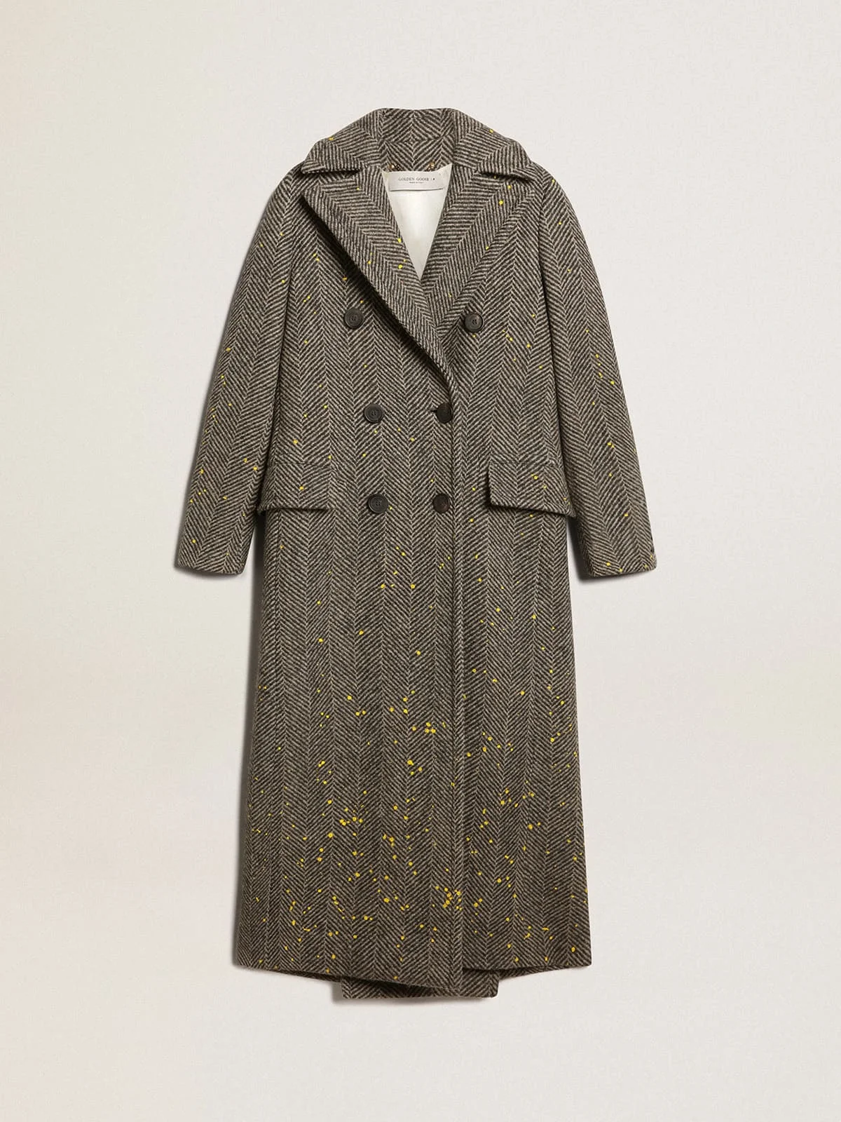 A unique, timeless collection that encapsulates the Golden Goose DNA, designed to remain with you every day, through thick and thin, come rain or shine. This regular-fit double-breasted coat in anthracite-gray chevron wool with herringbone pattern features yellow hand-painted details. The detachable white patch with a finely embroidered letter G in red adds the finishing touch. DETAILS Item No. GWP00496.P000497.81324 - Color: anthracite gray - Yellow hand-painted details - Double-breasted model - Detachable white patch with embroidered red letter G - Tone-on-tone martingale on the back - Regular fit - Two front pockets - Long sleeves - Fastening with black buttons - Main material: 100% virgin wool - Lining: 64% viscose, 36% rayon - Sleeve lining: 52% viscose, 48% acetate - Made in Italy The model is 177 cm tall and is wearing a size S.