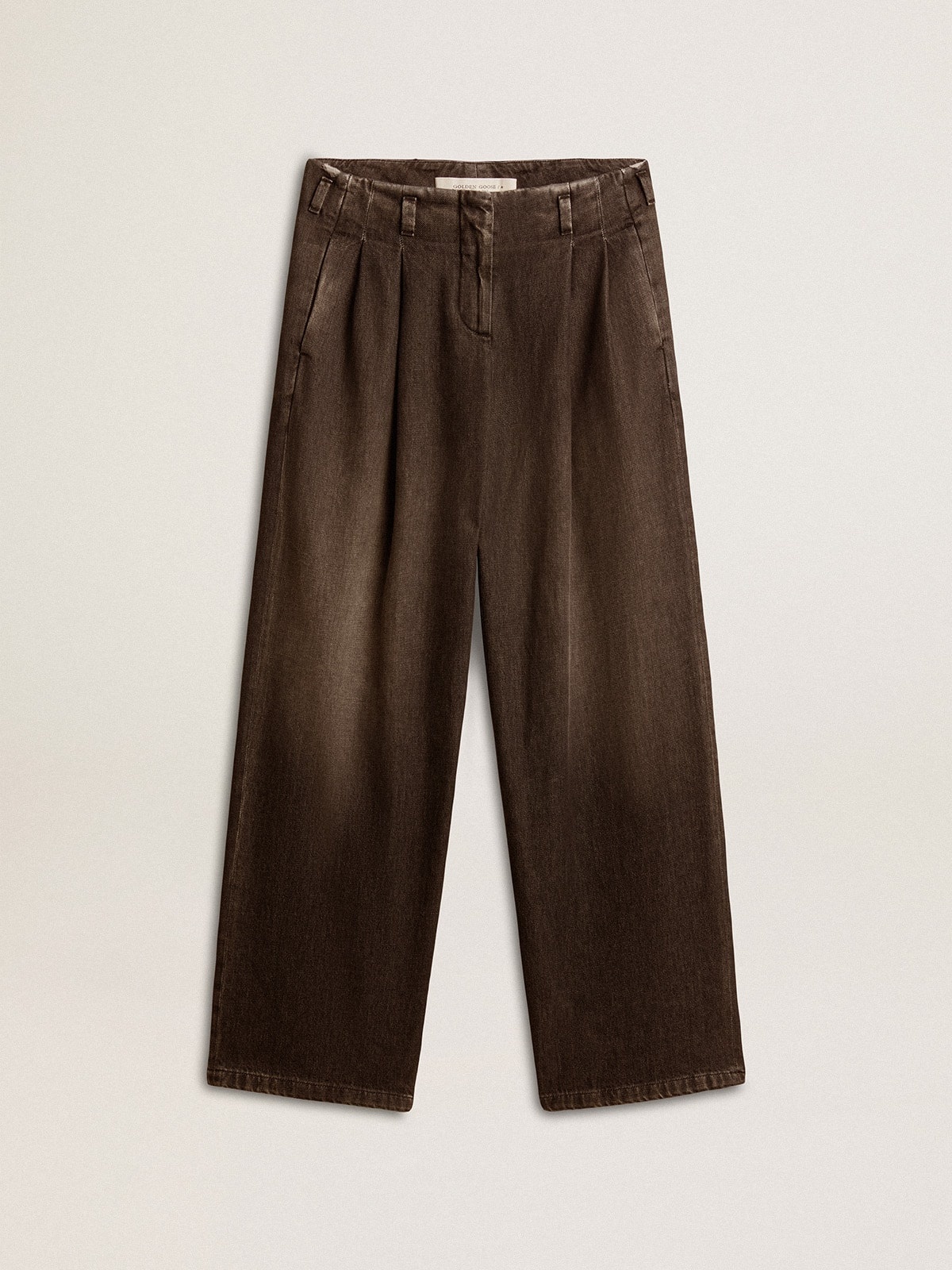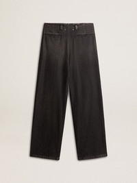 A love story to our home, Marghera. Where everything began. Our latest collection reflects the spirit of our birthplace, its contrasts, industrial soul, and manufacturing landscapes, weaving together inspirations from both the vibrant energy of workwear and the refined essence of traditional tailoring. These medium-wash cotton pants in black feature a wide leg and four pockets, two on the front and two welt pockets on the back. The pleats on the front add the finishing touch. DETAILS Item No. GWP01203.P000994.90100 - Journey Collection - Color: black - Double star on the back - Relaxed fit - Pleats on the front - Four pockets - Wide leg - Medium wash - Main material: 87% cotton, 13% polyamide - Pocket lining: 65% polyester, 35% cotton - Made in Italy The model is 177 cm tall and is wearing a size 40.