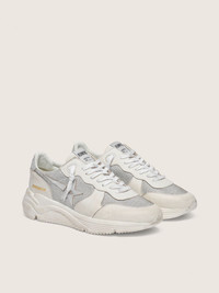 Urban style and a spirit of craftsmanship are combined in our Running Sole sneakers: the ideal companion for your metropolitan adventures. This women's model features a white mesh and nubuck upper, accentuated by a silver metallic leather star and heel tab. And optical white laces add the finishing touch. DETAILS Item No. GWF00215.F004934.10449 - White mesh and nubuck upper - Silver metallic leather star - Silver metallic leather heel tab - Optical-white laces - Vintage finish - Upper: 78% cow leather, 14% polyamide, 6% spandex, 2% sheepskin leather - Lining: 49% cotton, 26% polyester, 22% cow leather, 3% textile polyurethane - Sole: 100% rubber - Handmade - Made in Italy