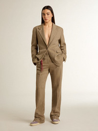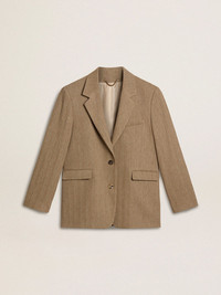 Inspired by the iconic Seventies, the carefree spirit of that era comes to life with the first drop of our Fall/Winter 25 collection. This regular-fit single-breasted blazer in sand-colored herringbone linen blend features two front pockets and two buttons as a fastening. The double star on the back adds the finishing touch. DETAILS Item No. GWP02461.P002089.82971 - Journey Collection - Color: sand - Regular fit - Single-breasted style - Two pockets - Two-button fastening - Main material: 61% linen, 38% cotton, 1% spandex - Inner lining: 54% acetate, 46% viscose - Made in Italy The model is 177 cm tall and is wearing a size 40.