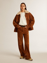 A love story to our home, Marghera. Where everything began. Our latest collection reflects the spirit of our birthplace, its contrasts, industrial soul, and manufacturing landscapes, weaving together inspirations from both the vibrant energy of workwear and the refined essence of traditional tailoring. These women's pants in split leather with corduroy-effect laser detailing feature a straight leg and antique gold finishes. DETAILS Item No. GWP01882.P001670.55194 - Journey Collection - Color: tobacco - Double star on the back - Regular fit - Four pockets - Fastening with antique gold button - Main material: 100% cow leather - Contrasting material: 100% cow leather - Lining material: 100% viscose - Pocket lining: 100% cotton - Made in Italy The model is 177 cm tall and is wearing a size 40.