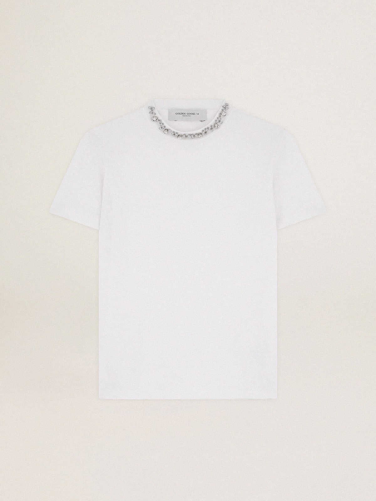 A unique, timeless collection that encompasses the essence of Golden Goose, designed to remain with you every day and accompany your highs and lows, come rain or shine. In white cotton, this regular-fit T-shirt features cabochon crystals on the collar and a detachable white patch with a finely embroidered letter G in red. DETAILS Item No. GWP01220.P000673.10363 - Color: white - Cabochon crystals on the collar - Double gold star on the back - Detachable white patch with embroidered red letter G - Regular fit - Short sleeves - Main material: 100% cotton - Made in Italy The model is 177 cm tall and is wearing a size S.