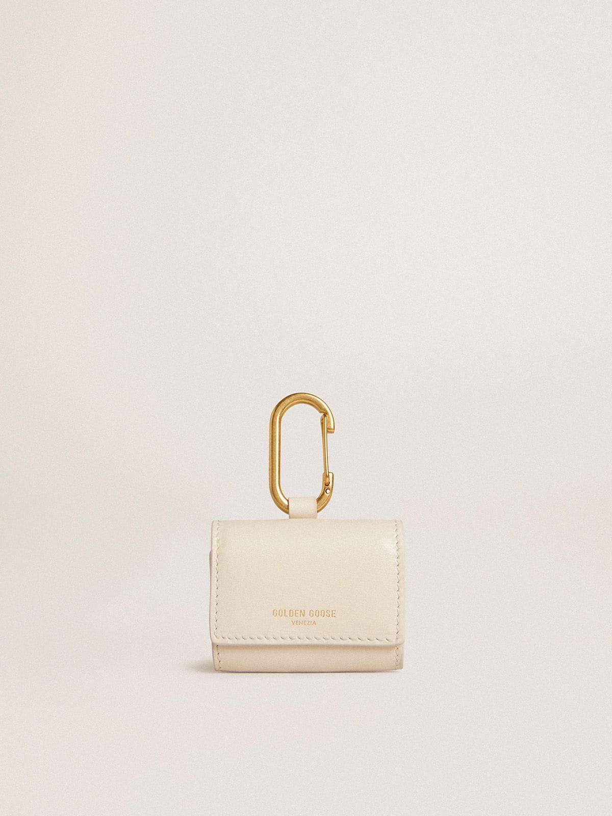 Designed to be both unique and practical, these travel accessories are perfect for your global adventures. In worn white, this AirPod case features an adjustable lanyard and gold-colored detailing. Golden Goose lettering in gold at the center and a snap button fastening add the finishing touches. DETAILS Item No. 8050235840041 - AirPod case - Color: worn white - Worn white adjustable lanyard - Gold-tone snap hook - Golden Goose lettering in gold - Snap button fastening - Length: 7 cm - Height: 6 cm - Width:1 cm