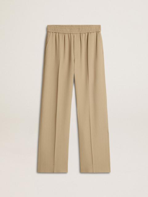 Men's travertine-colored sweater with 'Golden' patch lettering on the back