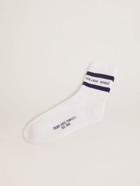 Women's cropped worn-white cotton polo shirt with blue ribbing